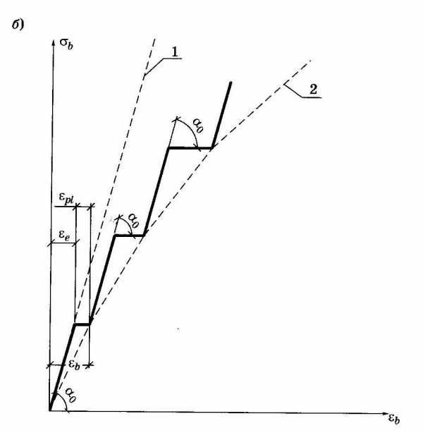 Наибольший практический интерес представляют продольные деформации бетона при осевом сжатии. Для изучения деформативности бетона при сжатии используют бетонные призмы с h/a = 4, чтобы исключить влияние на получаемые результаты сил трения, возникающих между опорными гранями образца и плитами пресса. На боковые грани призм в средней их части по высоте устанавливают приборы для замера деформаций (рис. 2.4а) или наклеивают электротензодатчики.