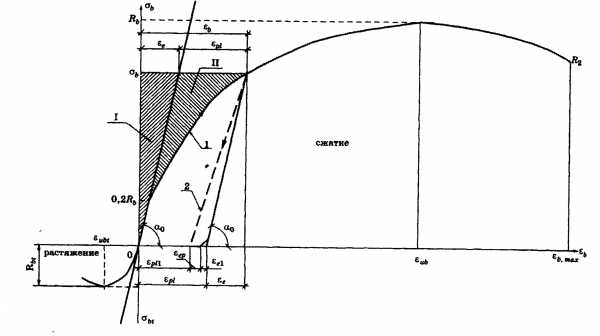 Рисунок 2.5 – Диаграмма зависимости между напряжениями и деформациями бетона при сжатии и растяжении: I – область упругих деформаций; II – область пластических деформаций; 1 – нагрузка; 2 – разгрузка; – предельная сжимаемость; – предельная растяжимость; – максимальная сжимаемость при нисходящей ветви диаграммы