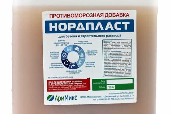 - Внутренние. Этот способ подразумевает использование специальных противоморзных добавок (ПМД). В состав ПМД входят особые химические соединения, которые не дают раствору замерзнуть раньше, чем закончится схватывание смеси. При использовании такого способа важно понимать, что даже самые качественные добавки не дадут смеси набрать марочную прочность при серьезной минусовой температуре. Они лишь помогают бетону схватиться, набрать около 25-30% прочности, затем смесь замерзает. После разморозки процесс твердения запустится снова.