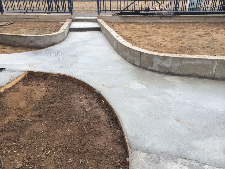 После этого начинаем собирать деревянную опалубку либо устанавливать бетонные бордюры, внутри которых будет залита бетонная плита. В зависимости от заданных нагрузок делаем армирование из сетки или арматуры. Если у вас небольшой объем бетона, то можно его приготовить самостоятельно при помощи бетономешалки, соблюдая пропорцию 1:2:2 (цемент-песок-щебень), на большой объем заливки проще заказывать бетон у производителей.