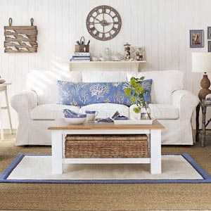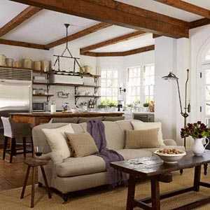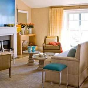 На диван положите маленькие подушечки. Лучше поменьше предметов ярко-красных или синих, они нарушают гармонию интерьера в спокойных тонах. Положите на пол персидский ковёр и гостиная преобразится.