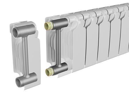 Биметаллические радиаторы аналогичны алюминиевым радиаторам, за исключением того, что в их конструкции вместо алюминиевого бака установлена стальная труба. Наличие такого разного внутреннего бака обеспечивает длительную работу и сочетает в себе основные преимущества двух типов радиаторов. Коррозия, вызванная внутренней жидкостью, исключена, а алюминиевый корпус обеспечивает эффективную теплопроводность радиаторов.