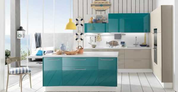 А если еще кухонный гарнитур светлого оттенка или покрыт лаком под цвет натурального дерева, тогда бирюза идеально впишется. При этом помните, что фасады на кухонном гарнитуре не стоит оформлять в слишком ярких цветах. Подберите, например, что-то из бирюзовых оттенков: темно-бирюзовый или бирюзово-синий.