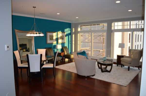 Учитывая то, что бирюзовый цвет ассоциируется с отдыхом и морской гладью, его настоятельно рекомендуют использовать в гостиной. Согласитесь, гостиная должна как можно лучше «принимать» гостей. А с таким цветом она не только даст возможность отдохнуть гостям и расслабиться, но и будет всегда выглядеть ярко и модно.