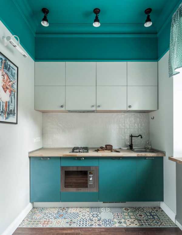 На фото компактная кухня с гарнитуром в бирюзовых тонах.