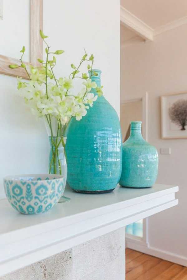 Декор играет немаловажную роль в дизайне интерьера. Аксессуары мятного оттенка дополняют нежный интерьер, например фарфоровые статуэтки, вазы, свечи. Темно-бирюзовые аксессуары станут яркими пятнами и могут гармонировать с предметами мебели.