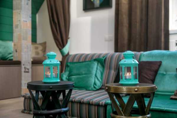 В сочетании с темными предметами мебели интерьер будет ярким, но освещающим. В гостиной со светлой отделкой диван цвета морской волны будет акцентировать на себе внимание и обозначит зону отдыха.