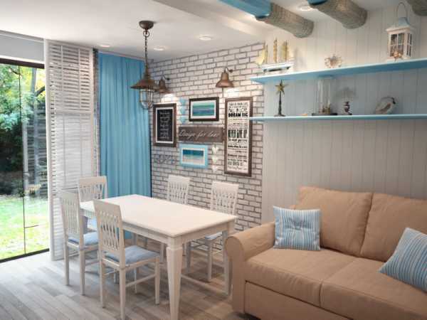 Бирюзовый цвет лучшее решение для оформления комнаты в морском стиле. Стены нежно-бирюзового цвета будут ассоциироваться с морским бризом и освежат интерьер. Отделка может быть в однотонная или с деталями морской тематики. В интерьере гармонично будет смотреться плетеная и светлая мебель.