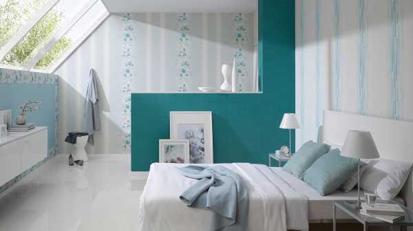 От большого количества сочного, насыщенного, бирюзового цвета в интерьере необходимо отказаться, чтобы не потерять на таком активном фоне остальные элементы, формирующие целостный образ помещения. Он может присутствовать в качестве акцентов на шторах, изголовье, в узоре обоев. Допустимо полностью сделать яркой одну из стен при условии, что остальные будут нейтральными и светлыми.