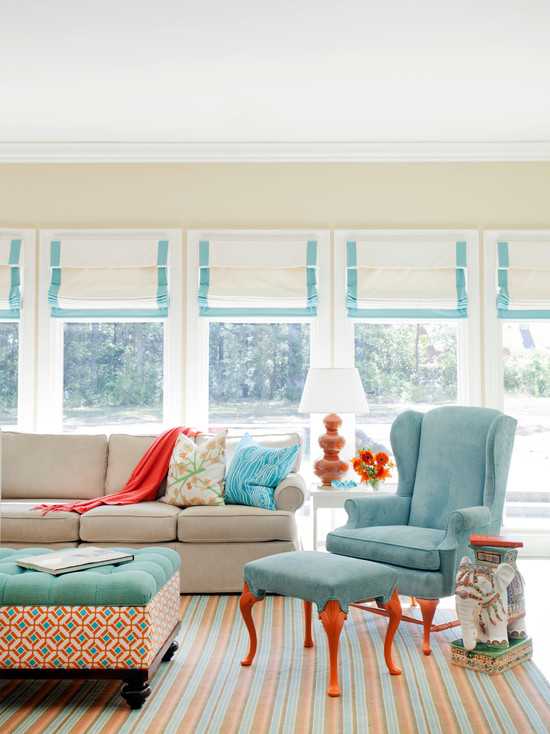 Сочетание берюзового и кораллового цвета в интерьере гостиной