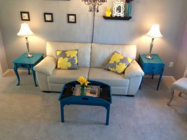 Сегодня производители изготавливают много моделей мягкой мебели в гостиную, выполненную в нескольких цветах. И потому выбрать удачную обстановку не составит труда. Например, бело-голубой диван или кресла смогут отлично дополнить интерьер в бирюзовых тонах. Здесь же, в зависимости от выбранного стиля, используйте журнальные столики из дерева, стекла или пластика. Причем, модели со стеклянной столешницей предпочтительнее, поскольку стекло придает воздушность и не выглядит громоздко, что актуально для маленьких помещений.