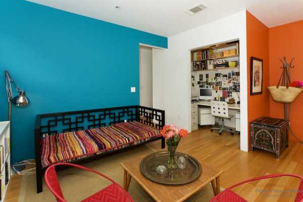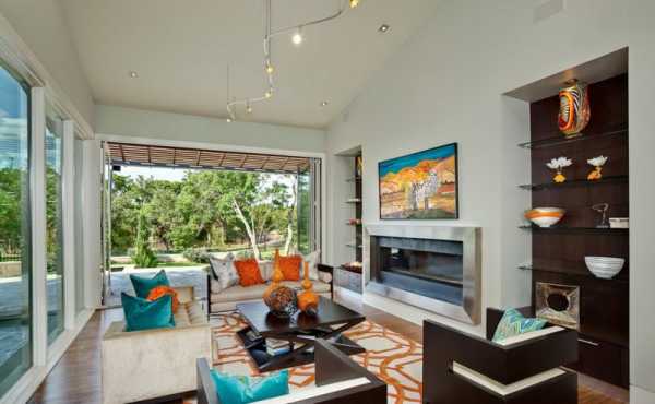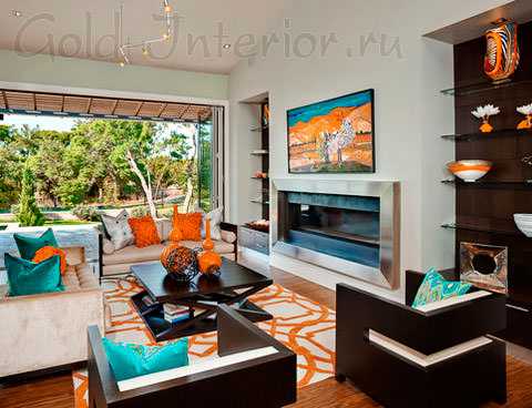 Сочетание оранжевого и бирюзового цвета в просторной гостиной
