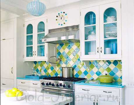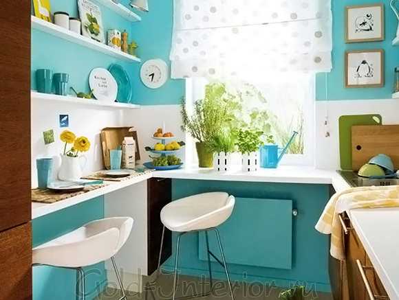 Кухня – место самое любимое и теплое в каждом доме. Здесь с особым старанием подбирается все убранство небольшого помещения. Для кухни чаще используются светлые, оттенки, яркие аксессуары. И бирюзовый цвет подойдет здесь как нельзя кстати. В этом цвете можно сделать фартук над плитой и разделочным столом. На нем эффектно заиграют солнечные желтые блики. И потом сочетать его с подушками на табуретах или легкими занавесками на окнах.