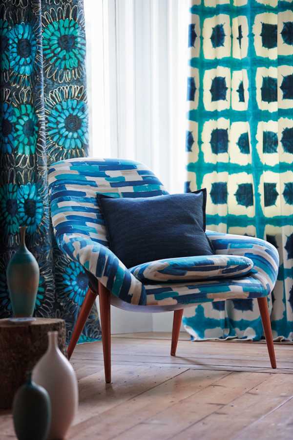Цвет отделки мебели – кресла, стульев, пуфика — призван сохранить равновесие, поэтому при пастельных стенах выбираются узоры с яркими бирюзовыми элементами. Если в оформлении стен применялись насыщенные тона, то обивка подбирается со спокойным колером.