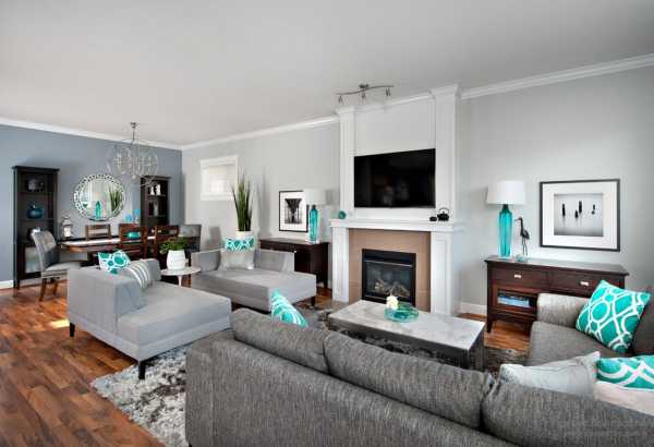 Эффектность, строгость и элегантность подарит интерьеру именно серо-бирюзовое сочетание. Такая комбинация довольно часто используется при оформлении гостиной в стиле функционализм, хай-тек, минимализм. Дизайнеры рекомендуют декорировать стены серым отделочным материалом, а аксессуары и мебель приобретать в бирюзовом цвете. Такое сочетание позволяет наслаждаться свежестью и, в то же время, полноценно отдыхать и расслабляться.