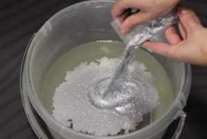 - Засыпьте порошок в воду. Размешивайте смесь руками, надев резиновые перчатки. Не стоит использовать какие-либо инструменты (вроде строительного миксера), из-за этого смесь будет неправильной консистенции. Результат использования такого состава непредсказуем.