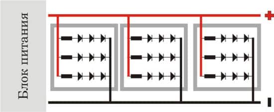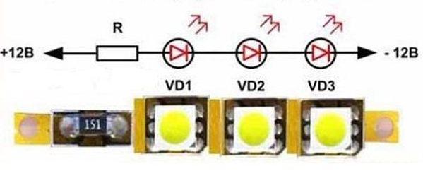 Ток потребления уменьшается при соединении кусочков ленты последовательно. В этом случае он равен току отдельного кусочка. При соединении нескольких отрезков последовательно напряжение конденсатора С2 умножается на их количество.