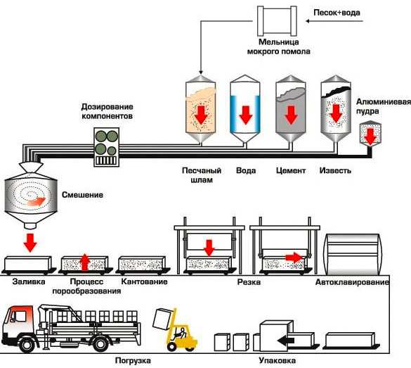 Производится дробление извести, песка и гипса, которое составляет основу для производства блоков. С помощью добавления воды песок перемалывают до состояния жидкой смеси. Ее отправляют в смеситель, в который добавляется цемент, гипс и известь. Далее компоненты замешиваются, и во время этого процесса в них добавляется алюминиевая суспензия.