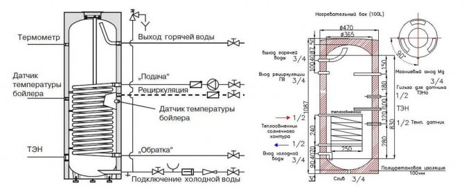 система патрубков: каждый бойлер оснащен специальными трубами, по которым подается холодная и выводится горячая вода, а также трубы, с помощью которых осуществляется подача (вход) и обратка (выход) теплоносителя.