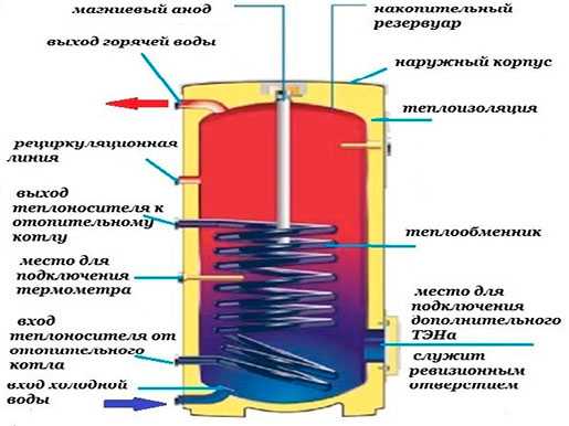 - Самым распространенным является конструкция со змеевиком, который устанавливается внутри бака, и по нему циркулирует горячая вода. Холодная вода, поступая в емкость, контактирует со змеевиком и нагревается до установленной температуры.