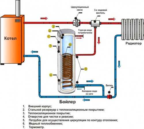 Бойлер с косвенным нагревом имеет два контура: нагревающий контур, в котором движется теплоноситель от котла, и контур с холодной водой, которую необходимо нагреть. Существует три основных схемы монтажа и подключения такого бойлера.