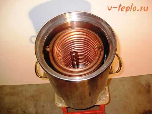 Этот элемент, сделанный из медной трубы малого диаметра, но толстостенной, обязательно может иметь различные габариты — это зависит от объема и высоты емкости. Специалисты утверждают, что на каждые 10 л. воды необходимо 1,5 кВт тепловой мощности змеевика.