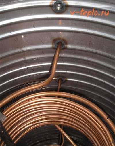 Теперь закрепляем теплообменник внутри емкости. Важно, чтобы трубки не касались стенок бака. Если бак металлический, то привариваются крепления на которые устанавливается труба. Места вывода и ввода в теплообменник выводятся наружу в заранее приготовленные отверстия и герметизируются сваркой.