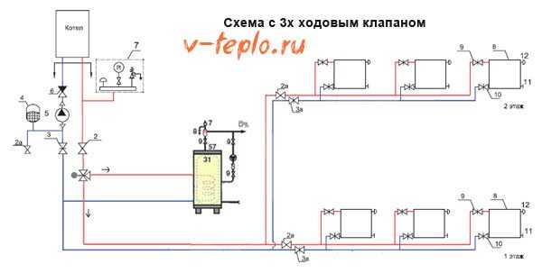 Использовать эту систему можно для подключения самодельного водонагревателя к котлу. Когда в бойлере снижается температура воды, термостат переключается, а вместе с ним – и клапан на три хода, который запускает нагревающую жидкость в движение. После подогрева воды клапан снова принимает прежнее положение, а тепловой поток котла возвращается в отопительную систему. Такая схема выгодна, если котел снабжен автоматикой и насосом, – управлять клапаном можно и через котел. Кроме того, она пригодится, если нужно большое количество нагреваемой воды, или вода имеет высокую жесткость, из-за которой контур подогрева может быстро приходить в негодность.