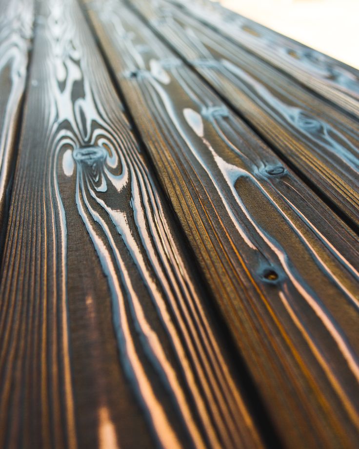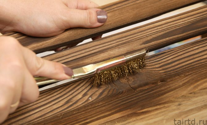 После обжига проводится браширование щеткой. После процедуры годичные кольца останутся темными, а на месте удаленных мягких волокон появятся светлые прожилки.