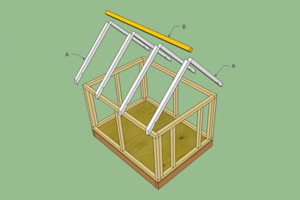 Изготавливается две конструкции, для каждой из которых используется два бруска размером 50х50 мм. Они соединяются друг с другом так, чтобы между ними получился угол 40 градусов. Заготовки устанавливаются вертикально на каркас вровень с меньшими стенами и закрепляются временно при помощи гвоздей. Две установленные заготовки в верхних точках соединяются между собой по горизонтали бруском с таким же сечением. При этом нужно предусмотреть, чтобы он в передней части конуры выступал на 200 мм. Далее, два бруска такой же длины закрепляются в нижних точках стропил.
