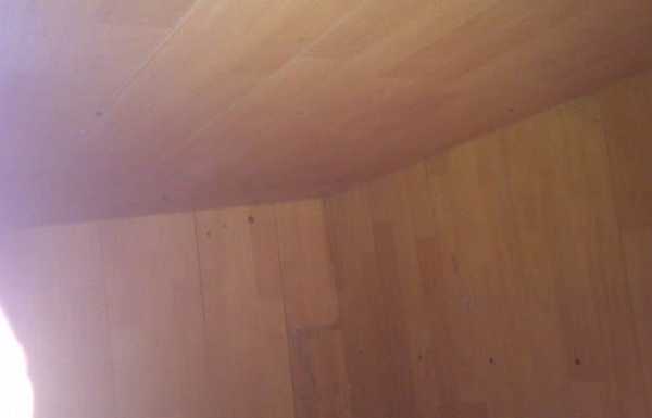 Временно зафиксированный каркас крыши снимается, а его внутренняя часть обшивается фанерой. Потом конструкция переворачивается в свое естественное положение. Далее, на фанере закрепляется пергамин, на который укладывается утеплитель. Затем теплоизоляционный материал накрывается снова пергамином. В конце закрепляется профнастил. Для его фиксации используются саморезы.