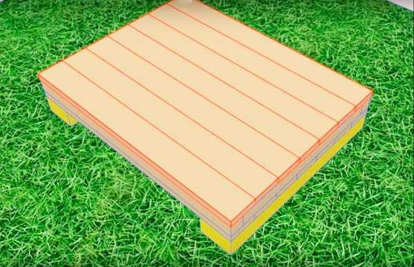 Рама, обшитая, с одной стороны, досками, переворачивается брусками вверх. Ее внутренняя часть застилает пергамином, который фиксируется с помощью скоб из степлера. Затем осуществляется укладка пенопласта между брусьями. Этот материал вырезается в соответствии с размерами рамы, а его толщина должна быть равна высоте брусьев. Потом утеплитель укрывается слоем пергамина и создается чистовой пол.