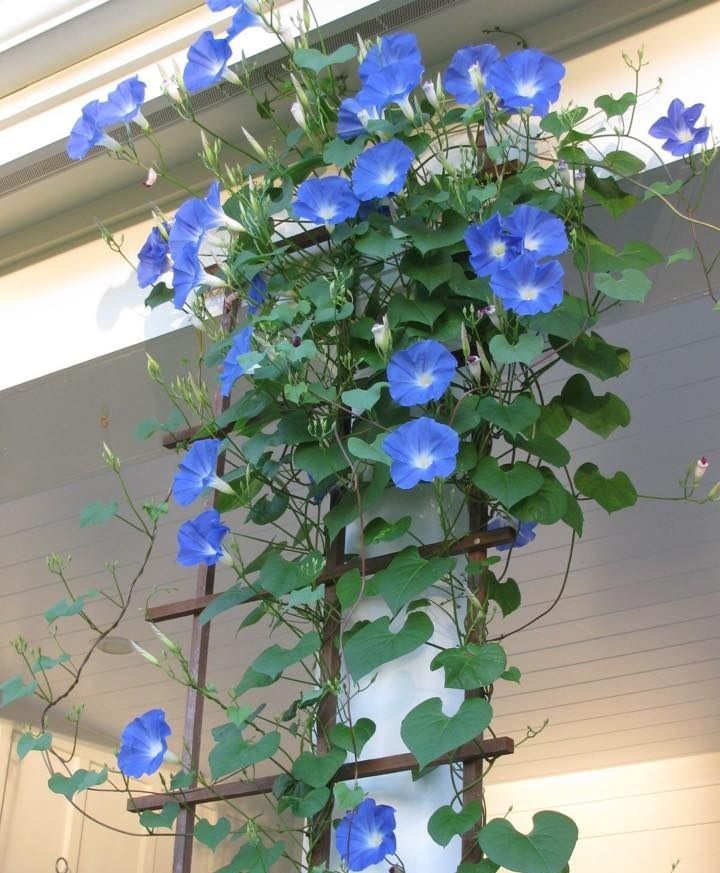 Вы можете посадить этот альпинист в полутени до полного солнца. Он демонстрирует зеленую листву и воронкообразные небесно-голубые цветы.