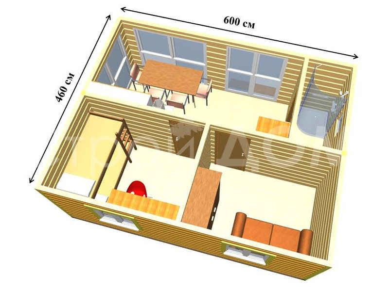 Домик разделен на 2-3 отсека. Это могут быть небольшие комнаты, используемые в качестве спальни и гостиной, а также прихожей или кухни. Назначение помещений определяют хозяева бытовки.