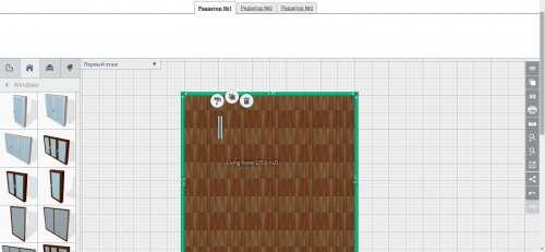 Еще один скриншот страницы онлайн–планировщика, который, кроме расстановки предметов мебели и декора, предусматривает выбор точного размера площади комнаты, что необходимо при планировании ремонта и дизайна, предлагает несколько вариантов окон, дверей, потолков и прочих конструктивных элементов.