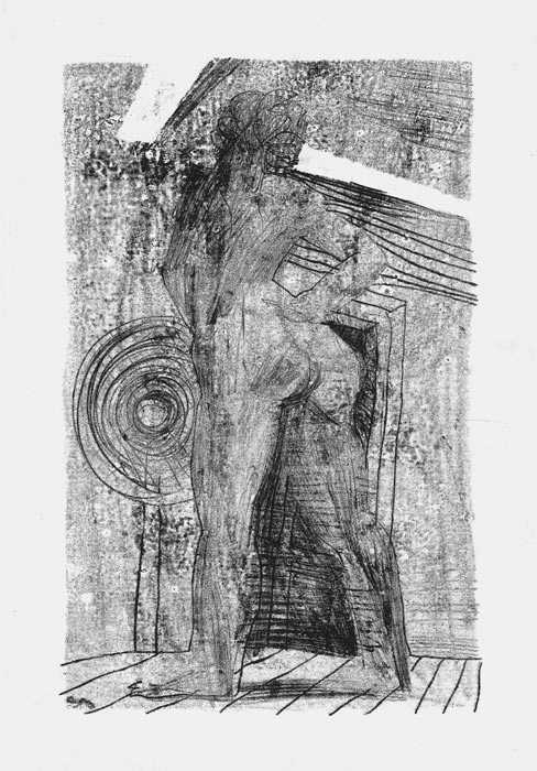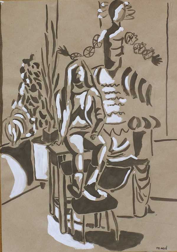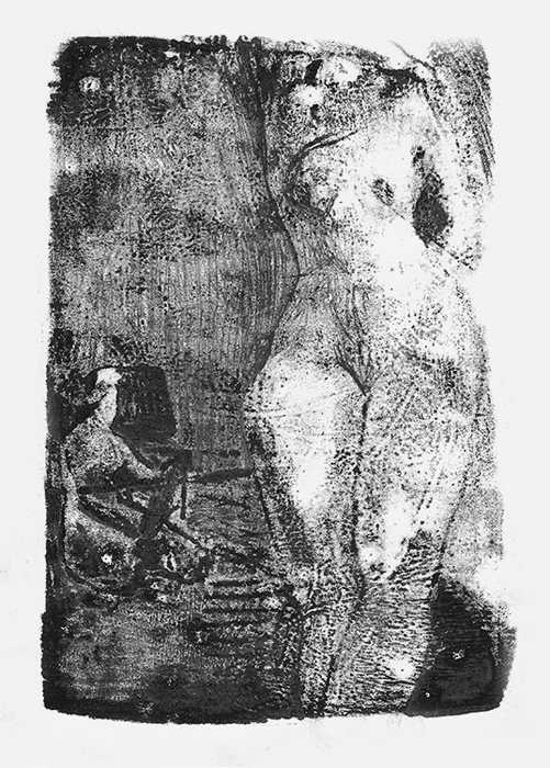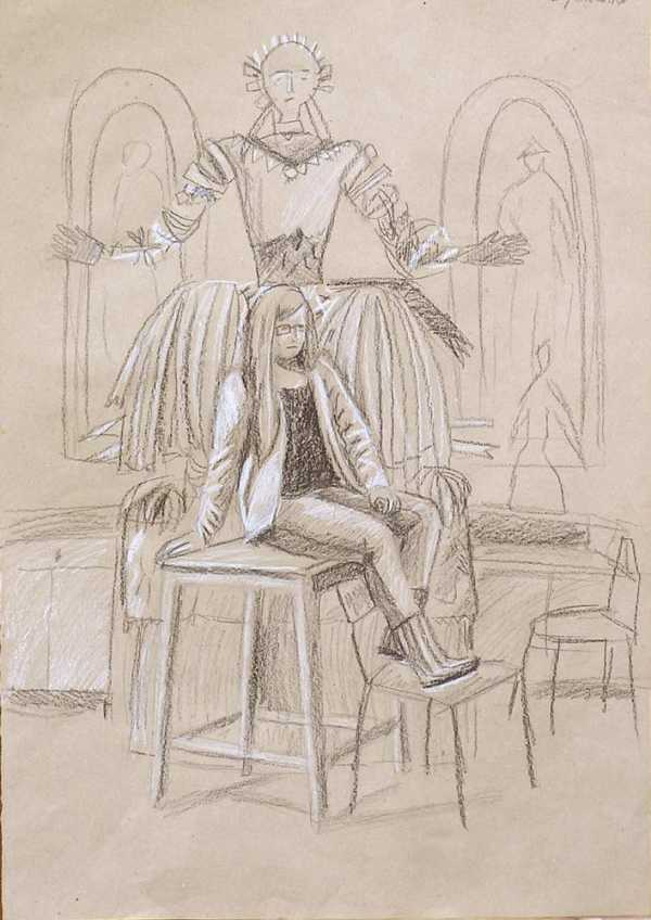 На первом занятии каждый рисовал любым выбранным материалом, а на двух других работали в технике диатипии. Вот тут я уже рассказывал подробно о технологии, не буду повторяться. Диатипия прекрасно подходит к этому заданию, так как разнообразные по силе и качествам фактуры предоставляют широкие возможности для организации листа. Но не все смогли совместить выполнение трудного задания с пробой новой техники, поэтому часть этих работ получилась про фигуру в интерьере, а часть — про диатипию как таковую.