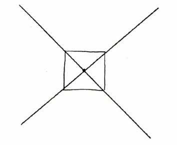 Теперь проводим горизонтали и вертикали посередине между точкой схода и краями листа. В результате эти линии должны образовать прямоугольник, углы которого будут находиться на диагоналях, опущенных из краев листа. Полученный прямоугольник обозначает противолежащую фронтальную стену.