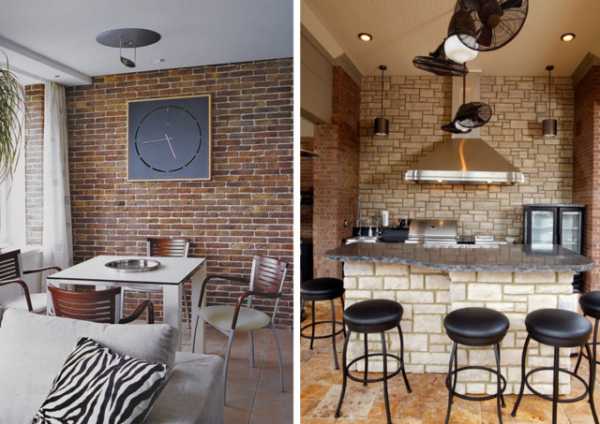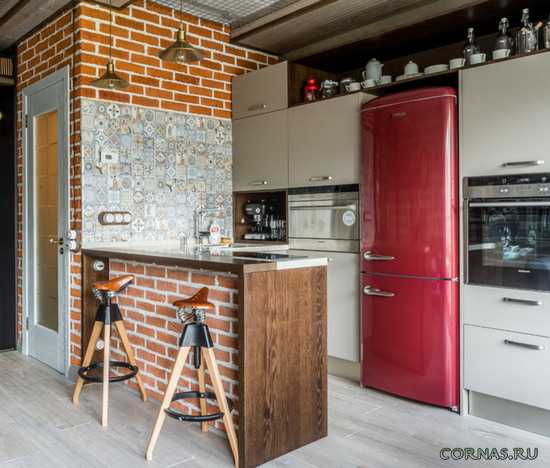Нередко используется в стиле лофт – применение необработанных материалов. Контраст оформления позволяет выделить и украсить пространство, например, рабочую или обеденную зоны (столик и стулья).