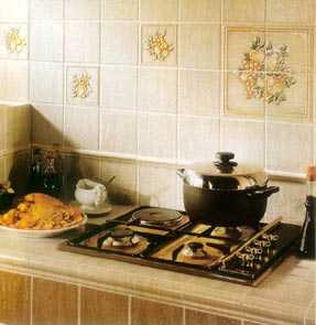 Керамическая плитка, пожалуй, самый распространенный материал для отделки фартука. Как уже говорилось выше, керамика обладает всеми свойствами, которые так необходимы для отделки стен на кухне.Особую популярность в последнее время завоевала керамическая мозаика. По сути, это плитки очень маленьких размеров (в большинстве своем 1—2 см в ширину и длину), из которых выкладывается простой или сложный узор. Создаются даже картины и панно из мозаики.