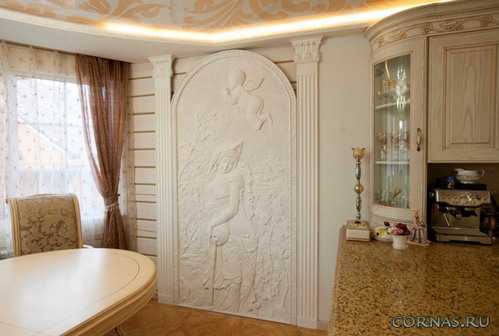 Еще один популярный, хотя и более дорогостоящий способ отделки стен на кухне – это декоративная штукатурка