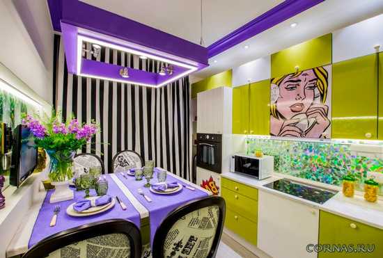 Можно заменить обои окрашиванием стен светлыми глянцевыми красками – они тоже зрительно расширяют пространство. При этом ярким цветовым пятном станет скинали – кухонный фартук из стекла с цветным принтом.