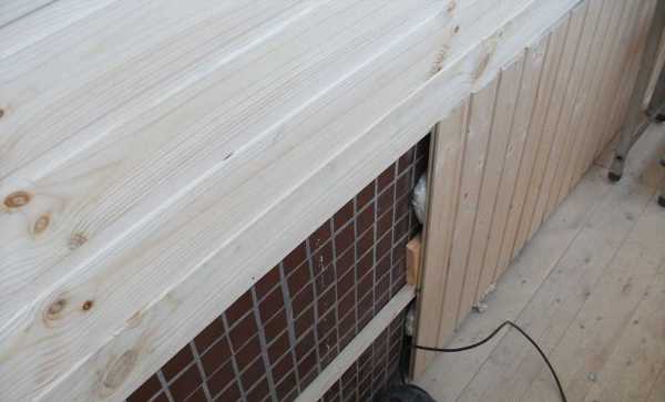 Шаг 4. Начинайте отделывать балкон с самого неудобного угла и двигайте по периметру. Тщательно контролируйте положение первой вагонки, она должна располагаться строго вертикально.