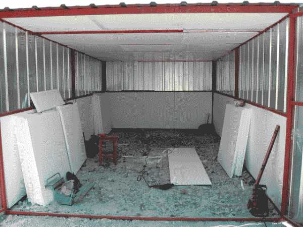 - Если гараж представляет собой простую металлическую коробку, то в этом случае наружные и внутренние стены обязательно утепляем. Утепление стен, в основном, делается изнутри помещения. Используют легкий пенопласт с отличной теплоизоляцией. Установка утеплителя можно быть таким же как внутренне утепление самого дома. Также пенопласт можно приклеить к стенам строения.