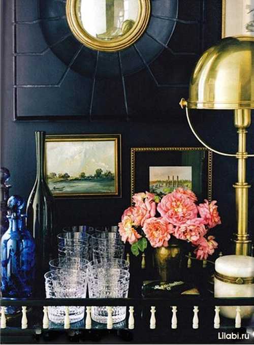 Яркие детали выглядят на черном фоне ещё более ярко. Поэтому, если Вы хотите создать спокойный интерьер с черными стенами, будьте аккуратны с цветными аксессуарами.