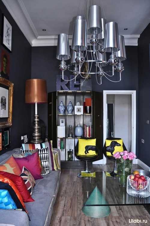 К примеру, в интерьере этой гостиной комнаты (фото выше) был использован матовый черный в сочетании с яркими аксессуарами. Лимонные, красные, розовые и голубые подушки, золотые рамы и бронзовый светильник: такие несочетаемые между собой цвета прекрасно чувствуют себя в темном интерьере не конфликтуя между собой по стилю.