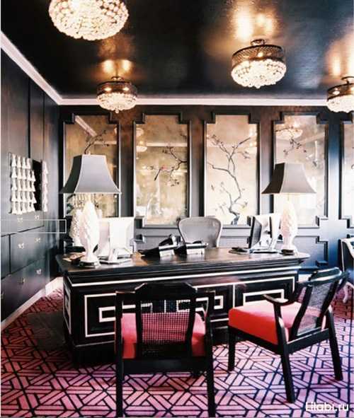 Кабинет также можно оформить черным цветом – в черное можно «одеть» одну стену, либо весь кабинет, если на обоях будет принт либо полоска, узор другого цвета. Ахроматическая гамма (сочетание черного с серым, белым) поможет сосредоточиться на работе, собраться с мыслями, продуктивно работать.