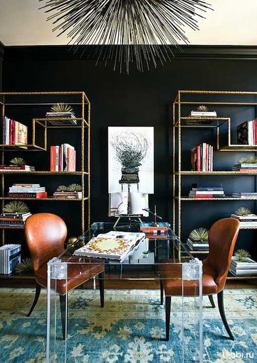 Ещё один из вариантов рабочего кабинета с черными стенами. Прозрачный столик и, как бы в противовес ему, тяжелые металлические стеллажи.
