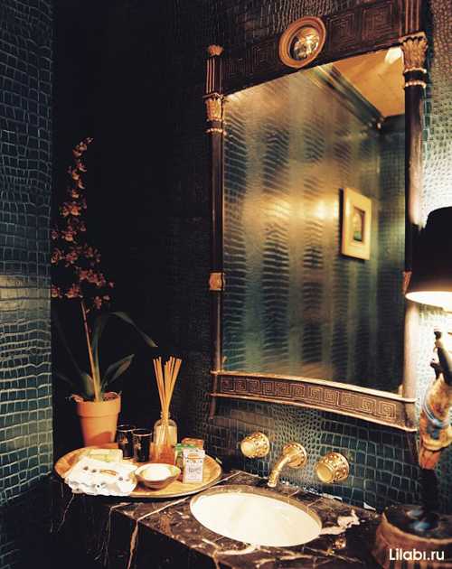 Черный цвет в интерьере ванной смотрится стильно и необычно. Такая ванная больше будет напоминать кабинет. Добавьте несколько золотых аксессуаров и хрустальные светильники и Вы точно удивите всех своим нестандартным дизайном.