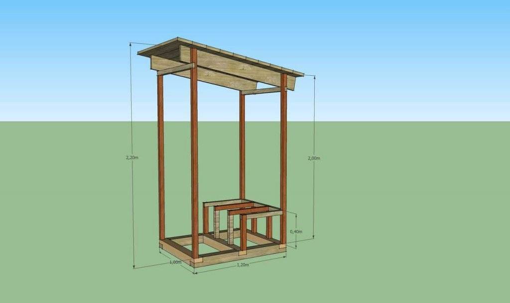 Сколоченная площадка-пол устанавливается на основание. Далее сооружаются передняя и задняя стенки, которые обшиваются вагонкой и устанавливаются на пол при помощи технологичных досок. Крыша монтируется из досок внахлест, а сверху закрывается коньком. Для сооружения кровли можно использовать профнастил, шифер или оцинкованные гофролисты.