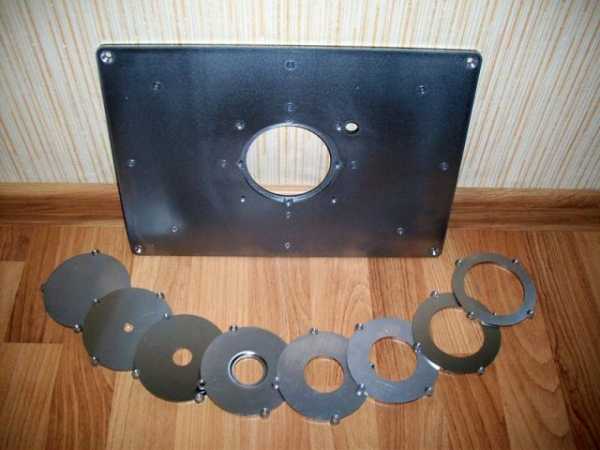 Монтажная пластина служит для крепления фрезера к столу, изготовляется она из прочных и качественных материалов. Для этого используется текстолит, металлический лист или фанера. Обычно существуют на самой подошве резьбовые соединения, для надежного крепления пластиковой кладки.